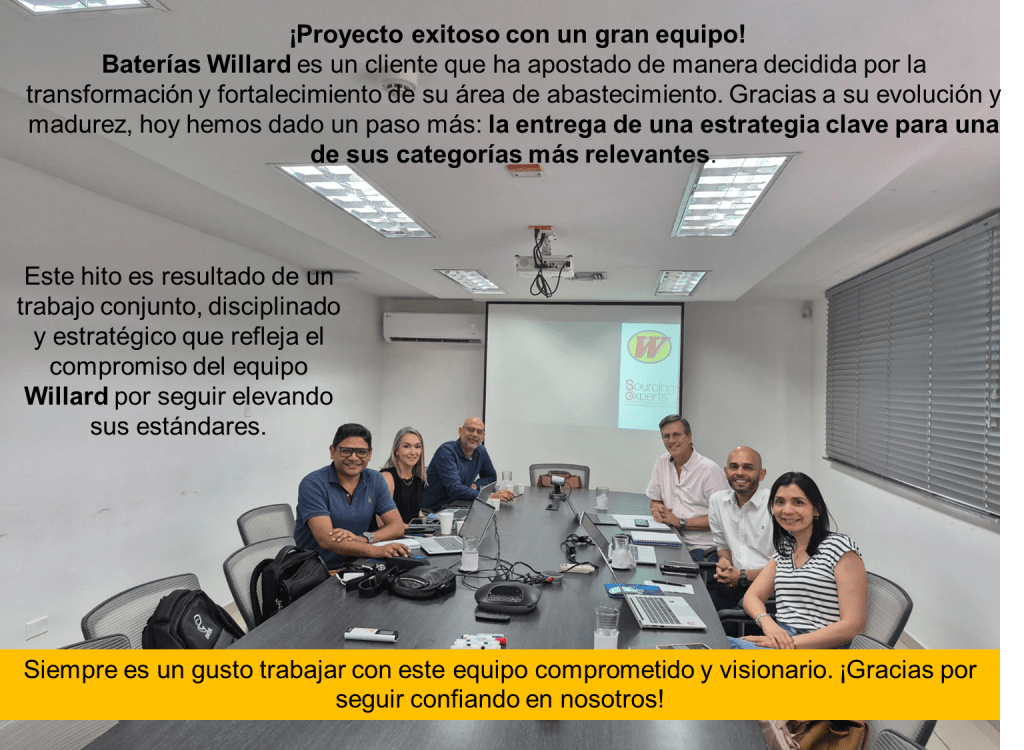 Con Baterías Willard cerramos un nuevo capítulo de transformación estratégica. Después de un gran trabajo en la madurez de su área de abastecimiento, hoy entregamos una estrategia clave para una de sus categorías más importantes. Siempre es un gusto trabajar con este gran equipo. ¡Gracias por seguir confiando en nosotros!
